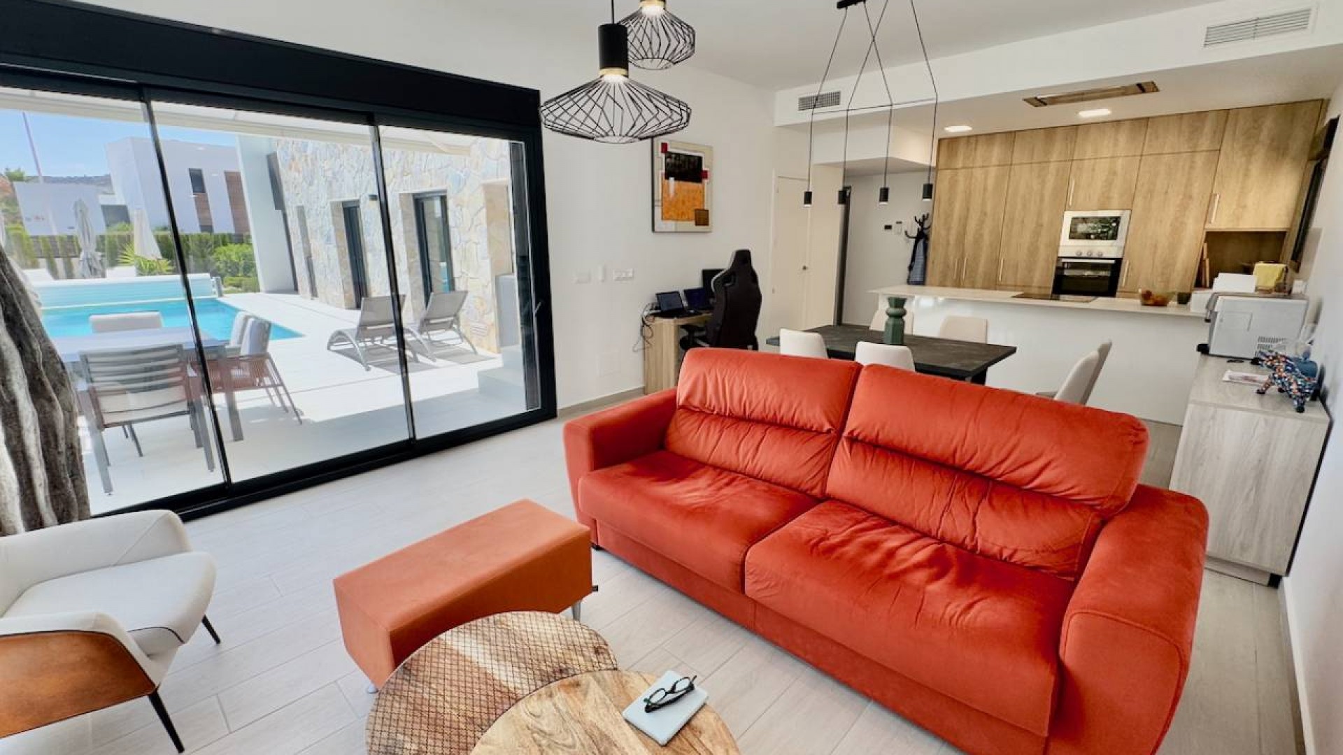 Moderne 3-værelses villa på La Finca Golf – Stil, komfort og ro. Velkommen til denne fantastiske moderne villa beliggende i hjertet af det prestigefyldte La Finca Golf Resort. Dette smukt præsenterede hjem med 3 soveværelser og 2 badeværelser er designet med rene linjer, åbne rum og elegante finish og tilbyder den perfekte blanding af luksus og ro. Træd indenfor og oplev et lyst og luftigt interiør med gulv-til-loft-vinduer, der oversvømmer rummet med naturligt lys og giver en problemfri udsigt over det omkringliggende grønt. Den åbne stue og spisestue er ubesværet forbundet med et elegant, fuldt udstyret køkken – ideelt til underholdning eller afslapning i stil. Den rummelige master-suite kan prale af et privat badeværelse og direkte adgang til terrassen og poolen, mens to yderligere dobbeltværelser deler et stilfuldt familiebadeværelse, perfekt til gæster eller familie. Udenfor imponerer villaen med en privat swimmingpool, anlagt have og flere terrasseområder til spisning, solbadning eller blot at nyde de fredelige golfbaneomgivelser. En privat indkørsel og rigelig opbevaringsplads fuldender pakken. Beliggende i gåafstand fra La Fincas klubhus, spa og restauranter, og kun en kort køretur fra strandene på Costa Blanca, er dette hjem perfekt som permanent bolig, ferieophold eller investering i lejebolig med højt afkast.