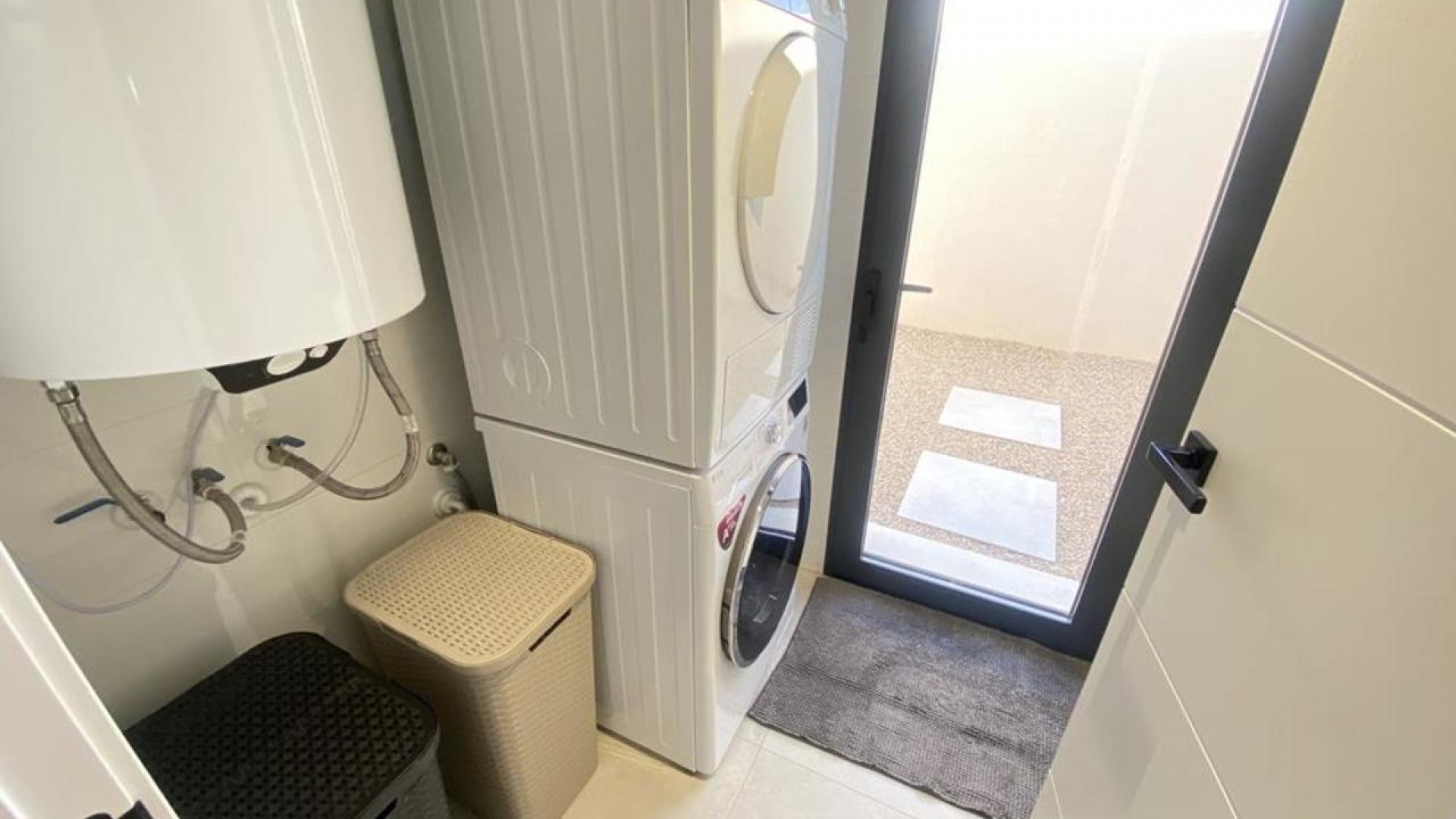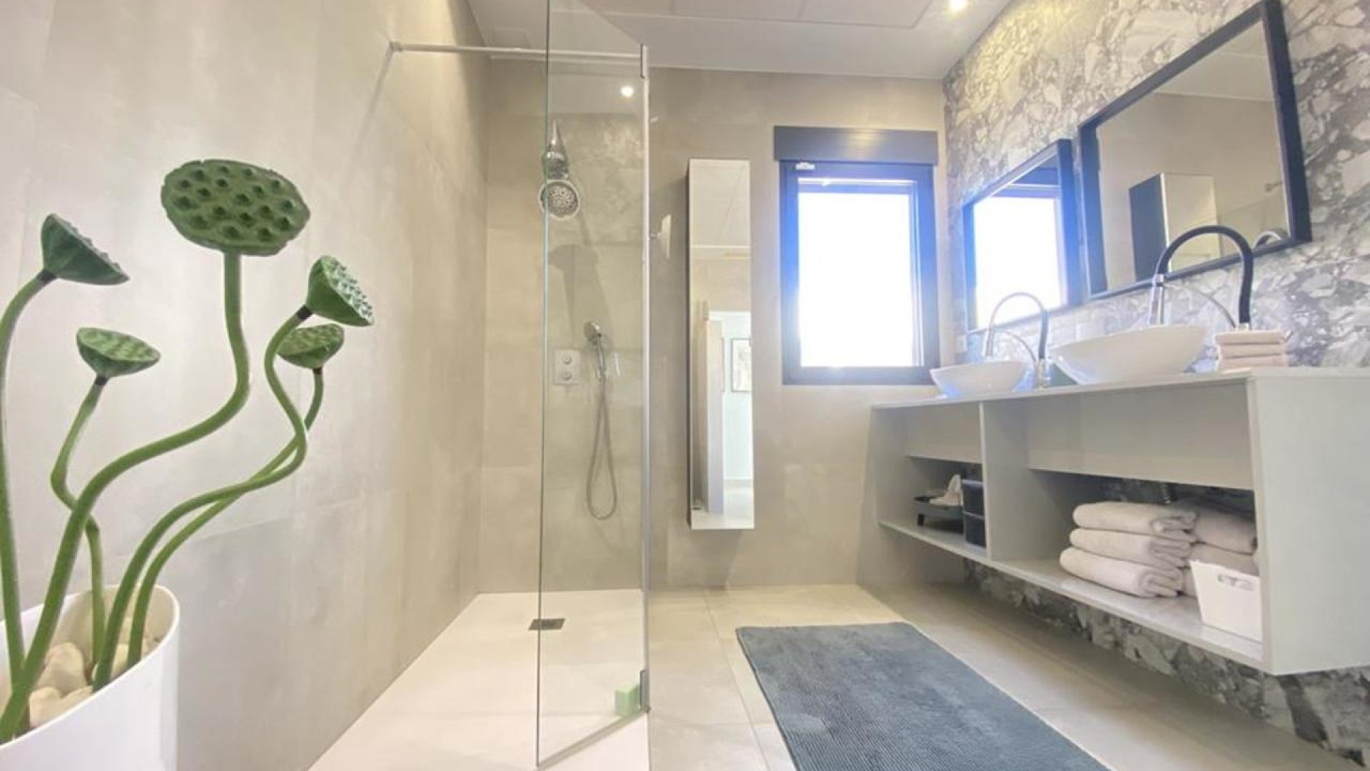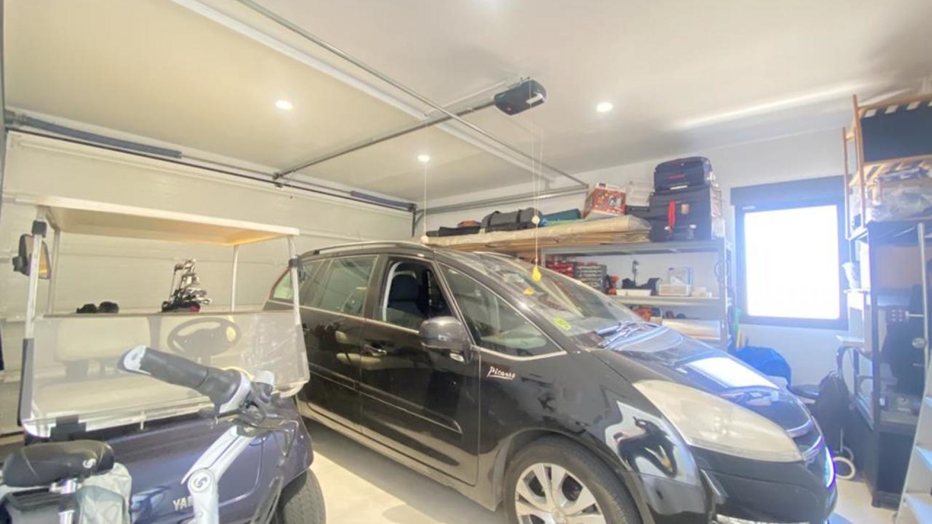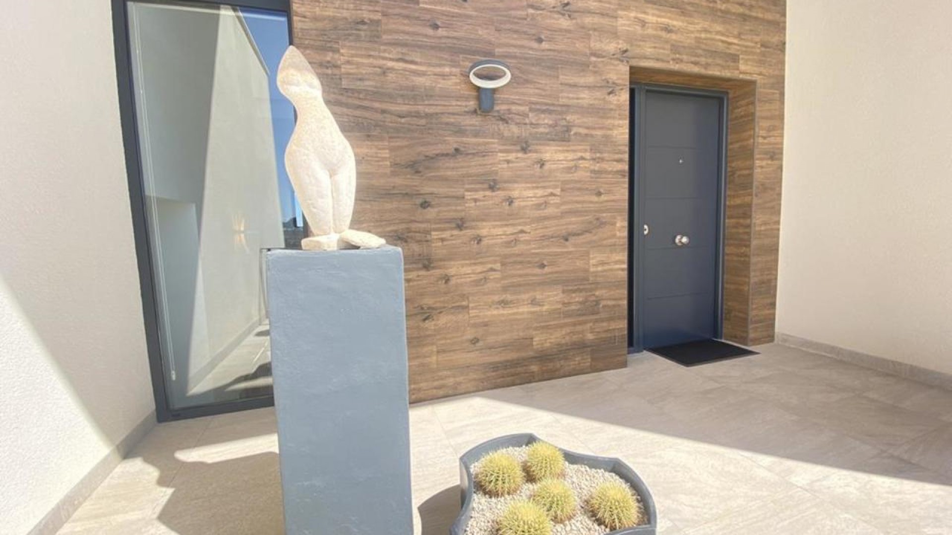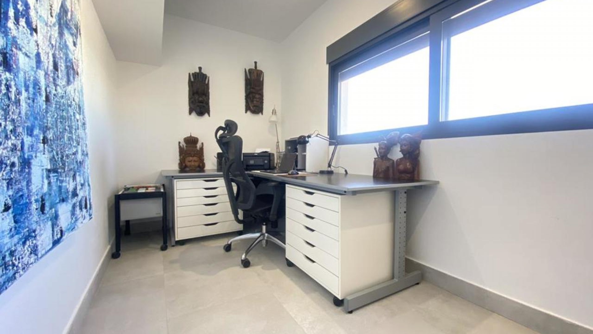 We dare to say this is possibly the most stunning villa in the Hacienda del Alamo Golf Resort. We are thrilled to introduce you this unique front line golf luxury villa, settled in a corner plot with 1157m2 , and full open views to the hills, golf course and the Resort. Recently built, and presented to its best, this property is ready for you to enjoy it. Entering the plot, you face a front garden with stairs to the main entrance, the landing leads you to two bedrooms and a share bathroom. From this bedrooms you access an amazing roof terrace with 360º view. To the left of the entrance door, you find a double garage and office. Going down the stairs, you already visualize the lounge-dining and open plan Italian design kitchen, which really outstand from this living area. Next to the kitchen, there is an additional bedroom, quite spacious with access onto a covered terrace and BBQ area, shower room and utility room. The master bedroom with ensuite luxury shower room and walk in wardrobe. From the bed you can contemplate the pool and garden area. The outside area is like an “oasis ”, the stunning salt water pool, all kind of cactus , palm trees, will make you really love outside living. Under the covered porch, you can chill or enjoy dinners with friends. Corvera airport is merely 15 mins drive and Fuente Alamo town, is just 3km away . More detais: Electric shutters Hi tech Italian kitchen White Goods Pellet stove Solar panels AC cold and hot