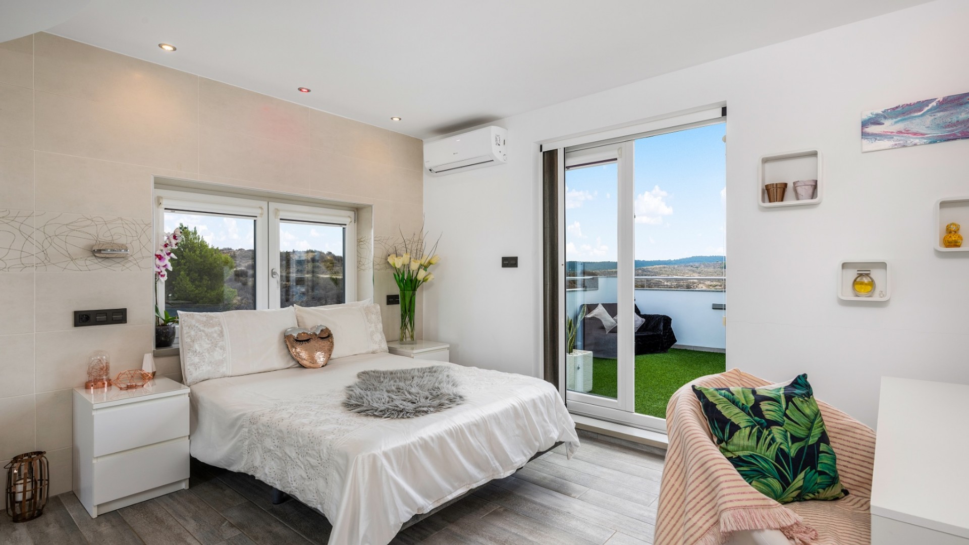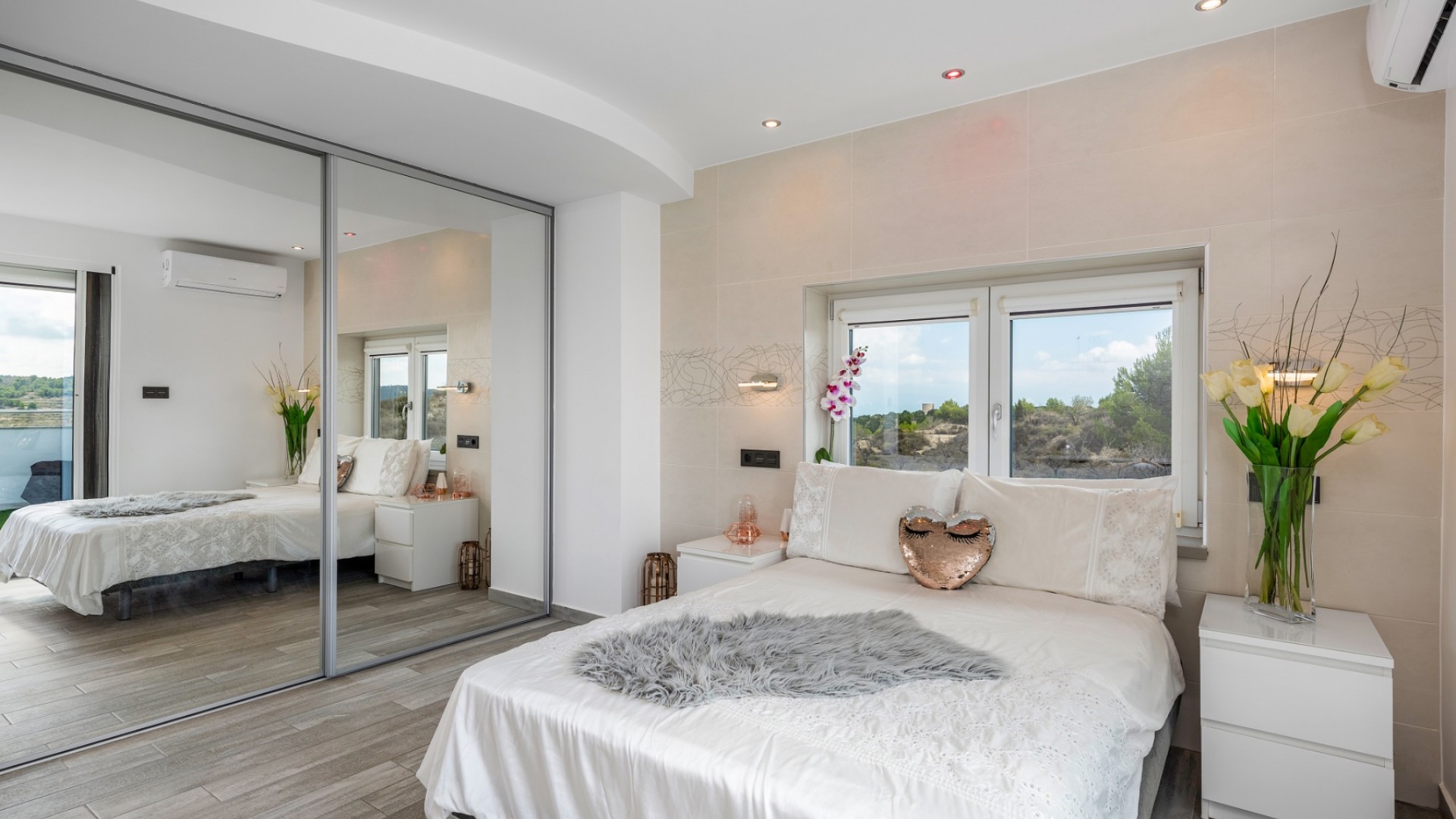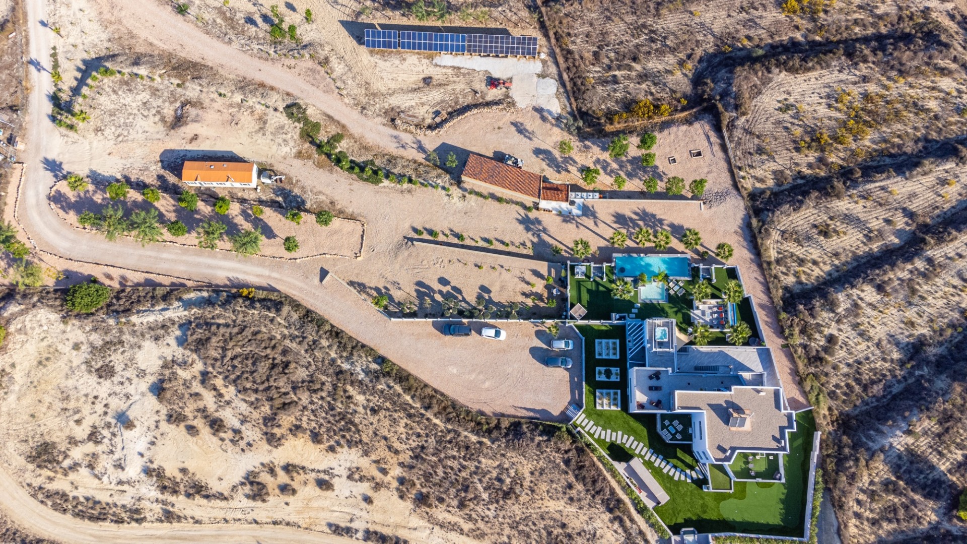 We are delighted to present to the market this stunning luxury unique off grid 6 bedroom, 5 bathroom Villa located above the village of Torremendo. This Villa has recently been constructed using the highest qualitiy materials and craftmanship. The villa is set over two floors,the main floor consists of an entrance area, a large open-plan kitchen with kitchen island and pantry, dining area and a large living room. From the dining room and living room you have direct access to two large terraces; one on each side of the property. One of the terraces has a jacuzzi and also has direct access to the garden. This floor also consists of three bedrooms and two bathrooms, one of which is en-suite and one bedroom is currently being used as a home gym.On the first floor you can find two guest bedrooms with a shared bathroom, a utility room and the master bedroom. The large master bedroom has an en-suite bathroom featuring both a bathtub and a shower. There is also direct access to a large private terrace with amazing views over the surrounding countyside. The villa is equipped with air condition in all rooms, underfloor heating throughout the property, double glazed windows (tilt/turn windows), security front door and spotlights throughout. THE VILLA IS COMPLETELY SELF SUBSTAINING , The electricity is generatates from 68 solar panels, with the added benefit of a backup generator. There is a water deposit that gets filled when needed, and all water used in the property gets recycled and used for irrigation. The villa is set on a plot of 15.960 m2. Surrounding the villa, the owners have created a beautifult garden with different entertaining areas. To the front elevation is the pool area consisting of a lovely heated swimming pool and spacious landscaped areas for sunbeds and seating , including a fully equipped kitchen with a bar facing the pool area, an outdoor shower, a full bathroom and a large barbecue area. By the entrance of the property you can find storage space, a lovely fountain and a putting green. The villa also has several terraces, two of them in the ground floor and two in the first floor. The rest of the large plot consists of a driveway, parking space for several cars and different fruit trees.The property is located just a short drive from the small village of Torremendo in Orihuela. In the village you can find some local shops, restaurants and cafés. The closest town is San Miguel de Salinas which is about 10-15 minutes away by car.