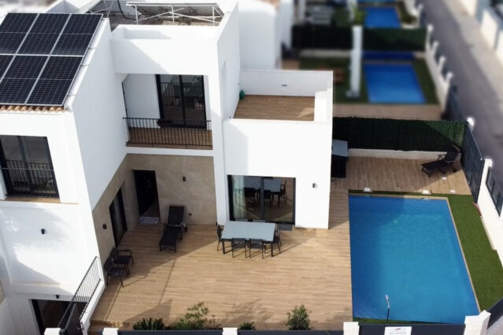 Un oasis de calma en un distrito codiciado y animado. Esta moderna casa combina un diseño limpio con cálidos acentos españoles y ofrece toda la comodidad para unas vacaciones de ensueño o una vivienda permanente. Aspectos destacados: Jardín espacioso y soleado con amplio aparcamiento Gran terraza y piscina privada (4 x 7 m) para disfrutar del clima cálido Acogedora planta baja: salón con cocina abierta, un dormitorio y un baño familiar Primera planta: rellano con acceso a dos dormitorios, un baño familiar adicional y una generosa terraza Sótano: dormitorio principal actual con baño en suite, pero con muchas posibilidades para espacio habitable adicional, una "cueva de hombres" o incluso un quinto dormitorio Extras prácticos: lavadero/trastero independiente, una segunda terraza espaciosa y una terraza estrecha para la caldera Características técnicas: aire acondicionado regulable (frío/calor), persianas eléctricas, intercomunicador y paneles solares Se vende completamente amueblado Una casa con un espacio inmenso y muchas posibilidades de distribución, distribuida en tres plantas. Ideal para quienes buscan comodidad, espacio y flexibilidad en una zona codiciada como Ciudad Quesada.
