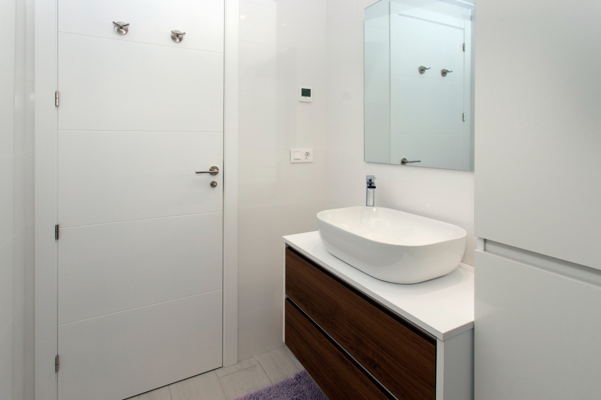 El dormitorio principal brinda tranquilidad absoluta, con un elegante baño en suite que incluye ducha a ras de suelo, inodoro y un estiloso mueble de lavabo, separado de la habitación por una moderna pared de vidrio. Desde el dormitorio principal, se accede directamente al jardín y a la piscina climatizada, un lujo que hace que cada día se sienta como vacaciones. También hay un segundo dormitorio con baño en suite, mientras que los dos dormitorios restantes comparten un elegante baño de invitados.