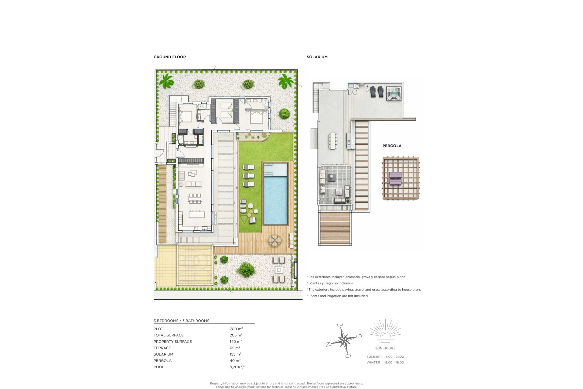 En el interior, la villa cuenta con tres dormitorios y tres baños, proporcionando un amplio espacio para toda la familia. Los dormitorios están equipados con armarios empotrados, optimizando el almacenamiento y manteniendo un diseño limpio y ordenado. El suelo de gres porcelánico añade un toque de elegancia y es fácil de mantener. La villa también dispone de un solárium, un espacio adicional que puede ser utilizado para diversas actividades, desde tomar el sol hasta crear un área de descanso privada. El garaje integrado ofrece comodidad y seguridad para el estacionamiento de vehículos.