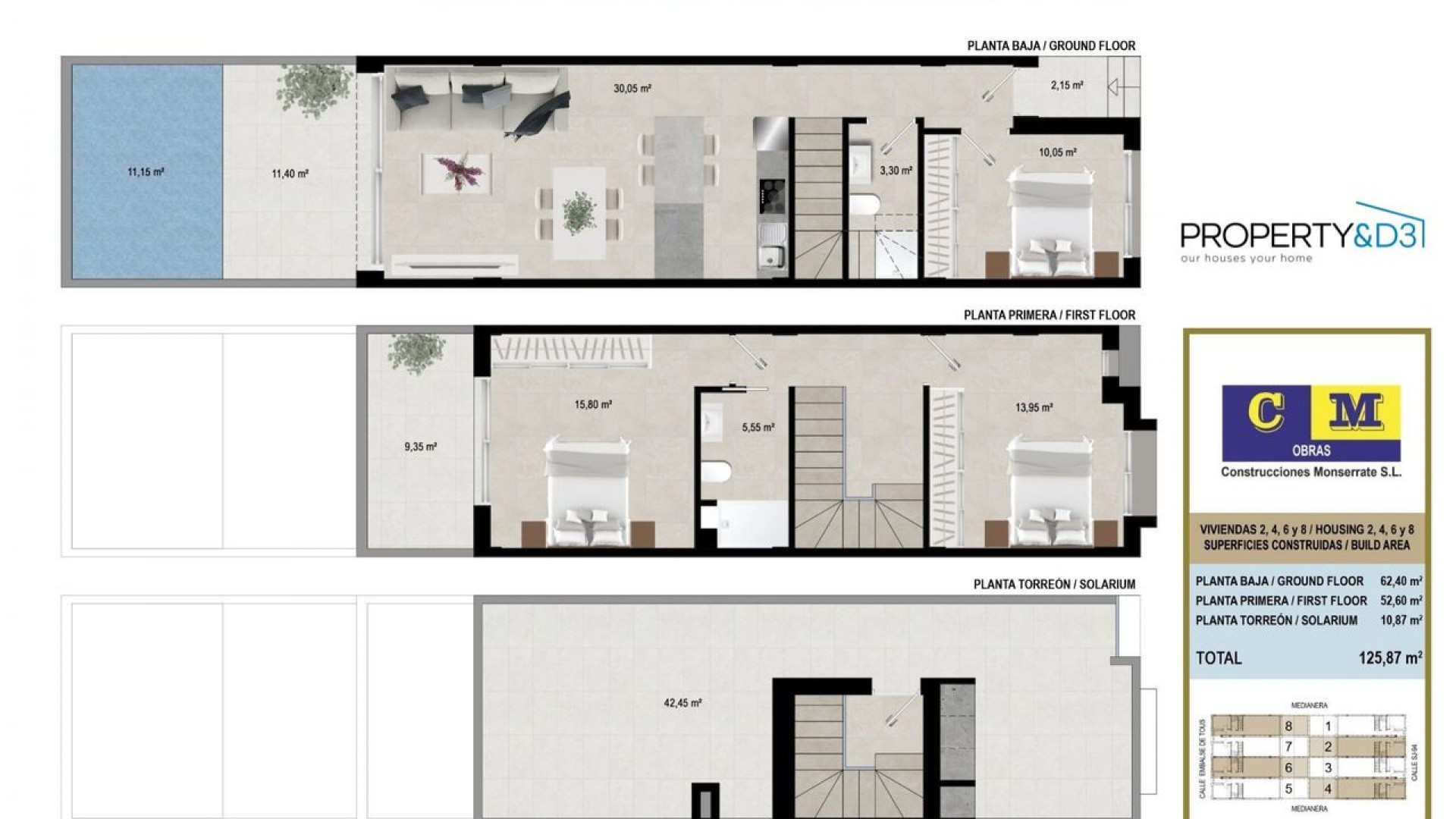 Français : Description : Bienvenue à Residencial Carmen III, une collection exclusive de 8 maisons de ville contemporaines dans le quartier recherché de San Javier, Murcie. Conçues dans un esprit de vie moderne, ces superbes maisons offrent : Caractéristiques principales : 3 chambres et 2 salles de bains avec des finitions de haute qualité. Piscine privée avec douche extérieure pour la détente. Grand solarium équipé d'une cuisine d'été et d'une pré-installation pour un lave-linge et une prise. Cuisine entièrement équipée avec des appareils modernes, dont un four, un micro-ondes, un lave-vaisselle intégré, un réfrigérateur, une plaque vitrocéramique et une hotte aspirante. Éclairage LED dans toute la propriété et les espaces extérieurs. Jardin paysager avec gazon artificiel. Pré-installation pour la climatisation canalisée. Emplacement privilégié : Situées à San Javier, Murcie, ces maisons de ville sont entourées de services essentiels, d'installations sportives et de plusieurs terrains de golf renommés. L'emplacement offre : 5 minutes des plages sereines de Mar Menor. 10 minutes du littoral méditerranéen. Confort supplémentaire : Armoires encastrées avec tiroirs. Salles de bains modernes avec meubles-lavabos, miroirs avec lumières, douches et paravents. Ces maisons sont construites selon les normes les plus élevées, offrant une combinaison parfaite de style, de confort et de commodité.