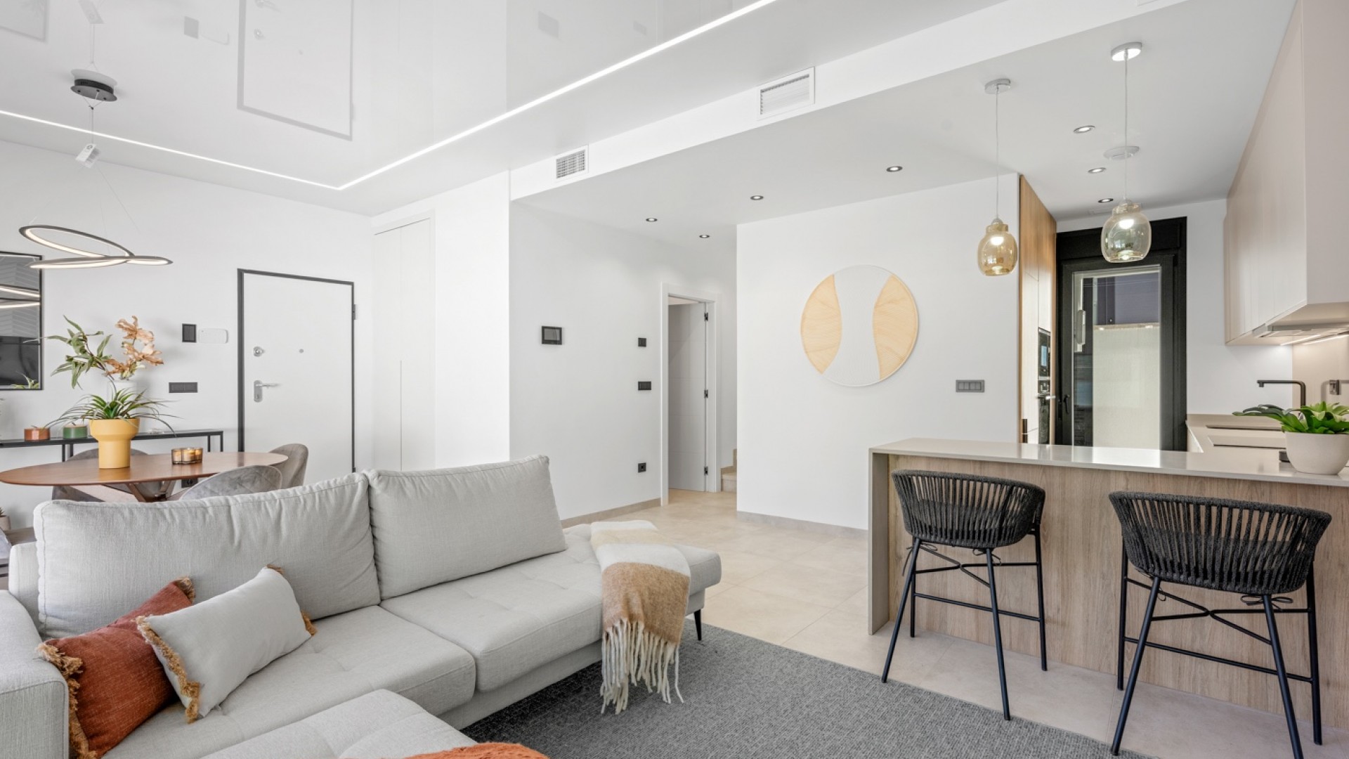Située à Blue Lagoon, à deux pas de toutes les commodités, cette magnifique villa, initialement conçue comme maison témoin pour le projet, offre un confort et une qualité exceptionnels. Les finitions haut de gamme, réalisées avec des matériaux de qualité, ainsi que de nombreux équipements de série (domotique, alarme, volets roulants électriques, etc.) en témoignent. Le séjour spacieux et lumineux s'ouvre harmonieusement sur la terrasse avec piscine privée, créant ainsi une agréable continuité entre intérieur et extérieur. Un parking sur place, à la fois pratique et sécurisé, est également disponible. Au rez-de-chaussée se trouve également une chambre complète avec salle de bains attenante, idéale pour ceux qui préfèrent tout avoir de plain-pied ou pour les invités. Jouxtant la cuisine se trouve un débarras avec accès direct à la terrasse exposée ouest, idéale pour profiter du soleil de l'après-midi et du soir. L'escalier mène à l'étage supérieur, où se trouvent deux chambres spacieuses, chacune avec sa propre salle de bains. De là, un second escalier conduit à un vaste solarium offrant une vue panoramique imprenable à 360° sur ce quartier charmant et paisible. La mer et le centre commercial populaire La Zenia Boulevard sont à seulement 10 minutes en voiture, tandis qu'un supermarché, une pharmacie et divers magasins sont accessibles en 3 minutes. La maison est vendue meublée et équipée de meubles design de haute qualité, vous permettant d'en profiter immédiatement et sans aucun souci. Une villa de qualité bénéficiant d'un emplacement exceptionnel, idéale comme résidence principale, maison de vacances ou investissement. Ici, vous pouvez vivre sans soucis, avec style et en plein centre-ville.