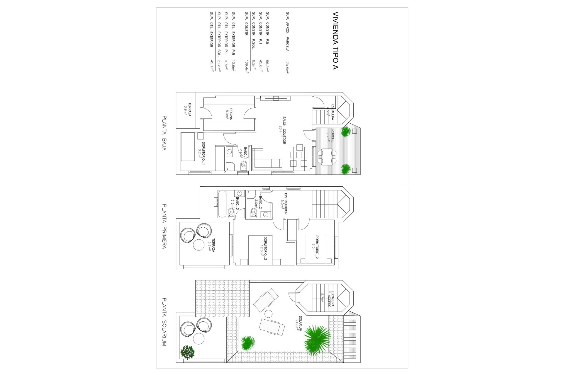 Les extérieurs de ces maisons indépendantes à San Fulgencio sont conçus pour maximiser le plaisir du climat méditerranéen. Chaque propriété dispose d'un jardin privé, parfait pour créer un espace vert personnel ou pour profiter d'activités en plein air. De plus, les terrasses spacieuses permettent de profiter pleinement des vues et de l'environnement, offrant un lieu idéal pour se détendre ou recevoir des invités. L'inclusion d'un solarium privé est une caractéristique remarquable, offrant un espace supplémentaire pour bronzer et profiter des vues panoramiques.
