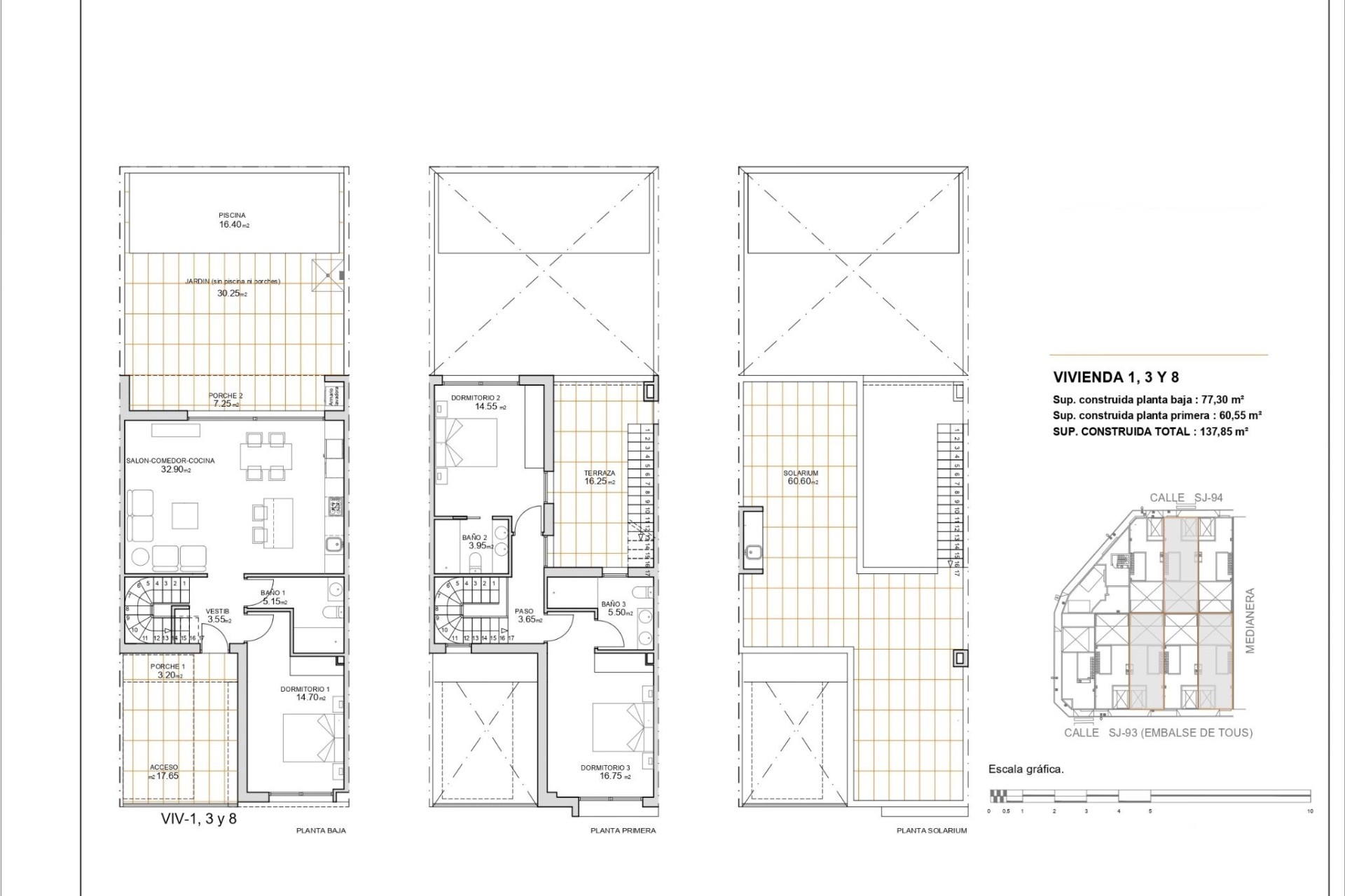 Przestrzenie zewnętrzne tych segmentów zostały starannie zaprojektowane, aby oferować miejsce do relaksu i rekreacji. Każda nieruchomość posiada prywatny basen, idealny do korzystania z słonecznych dni w prywatności własnego domu. Dodatkowo, tarasy zapewniają dodatkową przestrzeń na świeżym powietrzu, gdzie można cieszyć się widokiem na morze i śródziemnomorskim klimatem. Solarium to kolejna atrakcja tych domów, oferująca idealne miejsce do opalania lub cieszenia się kolacją na świeżym powietrzu z panoramicznym widokiem.