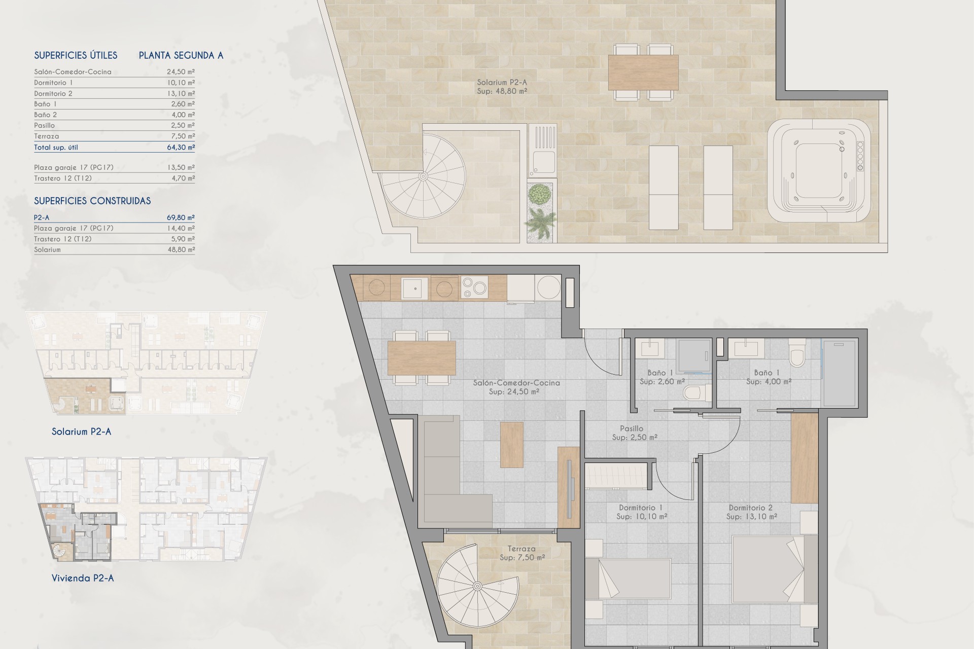 Przestrzenie zewnętrzne tych mieszkań zostały starannie zaprojektowane, aby oferować miejsce do relaksu i przyjemności na świeżym powietrzu. Każda nieruchomość posiada prywatny taras, idealny do korzystania z klimatu śródziemnomorskiego. Ponadto, niektóre typologie obejmują solarium, zapewniając dodatkową przestrzeń do opalania się lub podziwiania panoramicznych widoków. Obecność pergoli dodaje elegancji i funkcjonalności, umożliwiając tworzenie zacienionych obszarów dla większego komfortu. Dla tych, którzy szukają luksusu, niektóre mieszkania mają prywatny basen i jacuzzi, idealne do relaksu w zaciszu domowym.