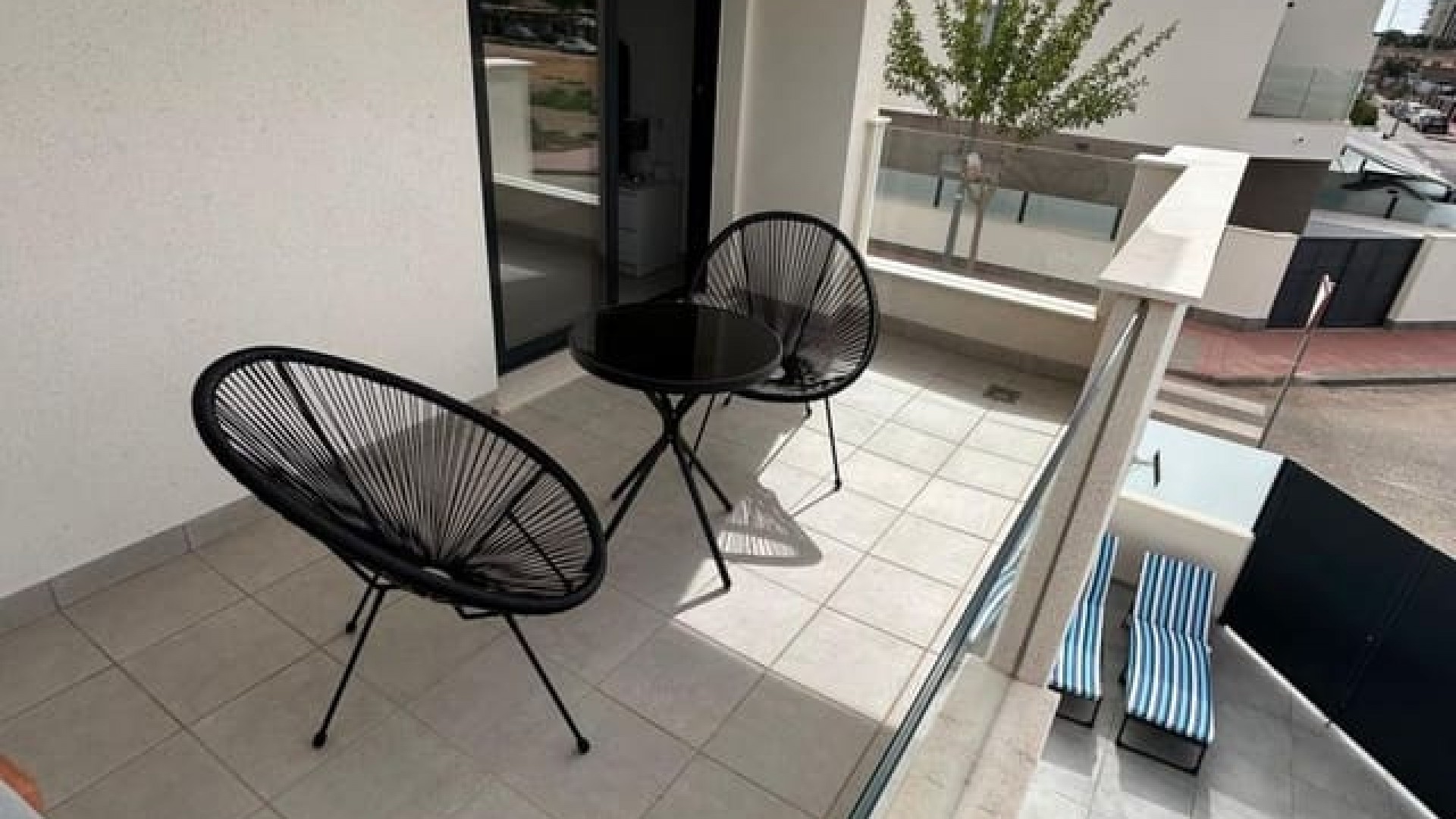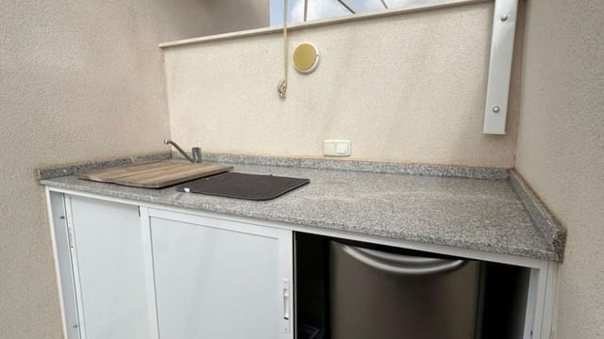 3 sovrum, 2 badrum parhus syd/östläge villa med privat pool och privat solarium i Santiago de la Ribera. Stor tomt med gated uppfart som leder till en stor terrass på framsidan. Den stora poolen ligger på framsidan av fastigheten och det finns gott om plats för middagar och solbad. Huset har ett stort vardagsrum med utsikt över poolen och ett modernt fullt utrustat kök i öppen planlösning. Bortom köket finns ett dubbelrum med inbyggda garderober och en dörr som leder till sidoterrassen. Det finns också ett modernt duschrum på bottenvåningen På första våningen finns två dubbelrum med inbyggda garderober. Sovrummet på framsidan av huset har tillgång till en terrass. Även på denna första våning finns ett modernt duschrum. Det finns trappor från första våningen som leder dig till ditt eget privata taksolarium med utomhuskök. En annan fantastisk utomhusbostad. Det här huset är bara två år gammalt och kommer att säljas fullt möblerat. Det är inom gångavstånd till stranden och en kort bilresa till Dos Mares köpcentrum och Pinatar-butiken. Murcias flygplats ligger cirka 30 minuters bilresa bort och Alicante ligger cirka 1 timmes bilresa bort. Det finns också några barer och kaféer i närheten av fastigheten. Santiago de la Ribera är en vacker stad på stranden av Mar Menor. Det är kustområdet i staden San Javier och började som en enkel fiskeby. Det har nu blivit ett populärt semestermål som lockar inte bara spanjorer utan även turister från hela Europa. Santago har en modern känsla, även om den fortfarande har kvar sin "fiskeby"-atmosfär. Den har en mycket vacker strandpromenad med majestätiska palmer och 2 kilometer vackra sandstränder. Härifrån kan du ta en båttur över det lugna vattnet i Mar Menor, till La Manga Strip på andra sidan. Det främsta shoppingområdet ligger egentligen i staden San Javier, men det finns några butiker på de smala gatorna att titta på, prova det på en onsdagsmorgon när det är en stor gatumarknad.