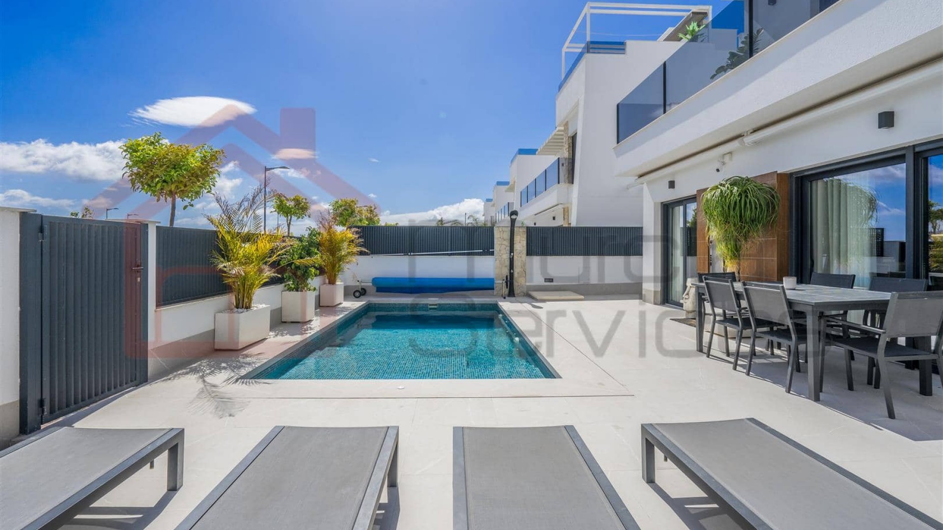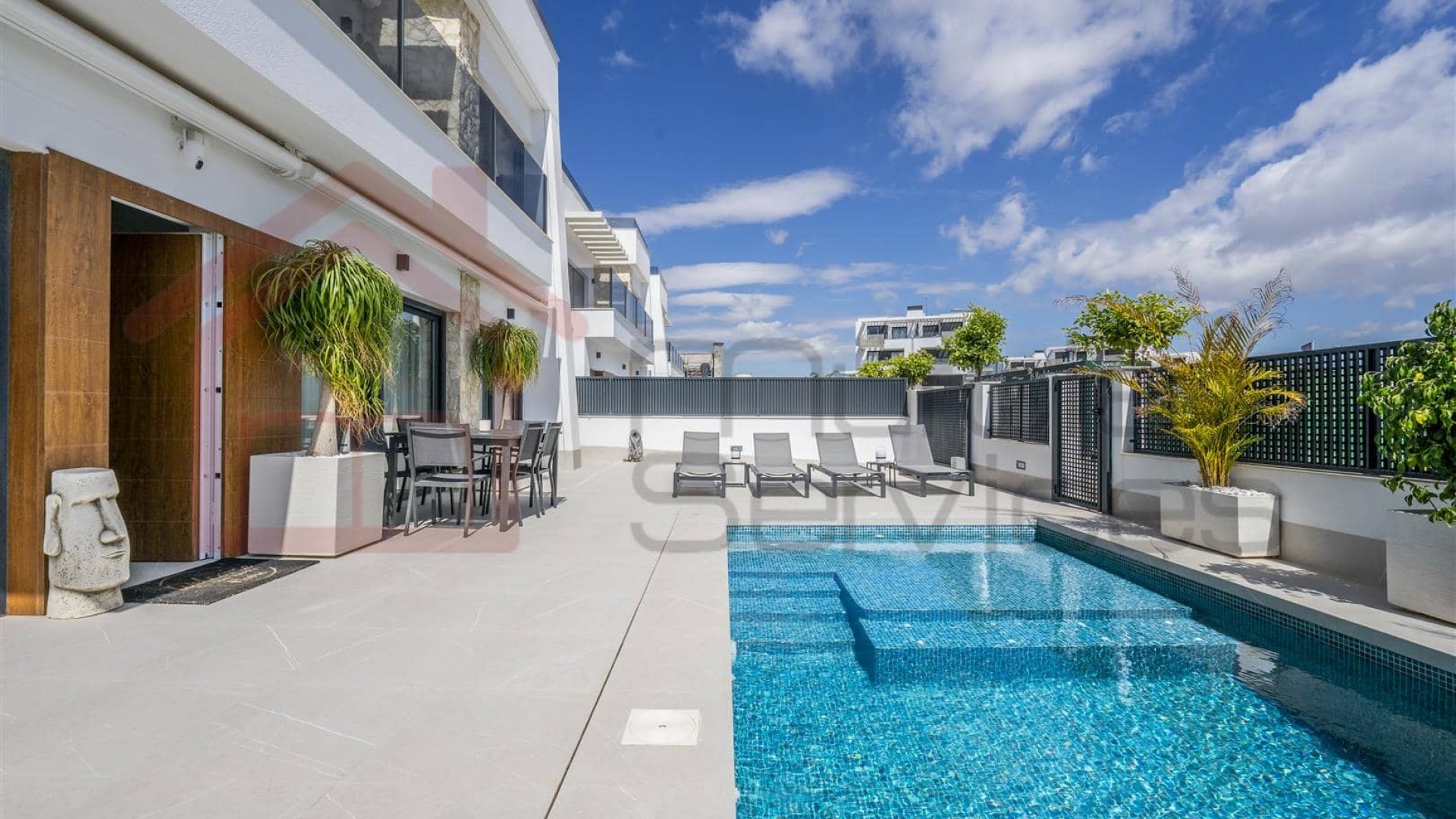 EXKLUSIV villa med 4 sovrum och 4,5 badrum vid Santa Rosalia-sjön och Life Resort. Möblerad till en utmärkt standard av en professionell inredningsarkitekt. Alla sovrum är dubbelrum med inbyggda garderober. Tre av badrummen har eleganta en-suite-badrum. Det stora sovrummet har en walk-in-garderob och tillgång till en privat terrass. Det finns en stor källare som har en separat glasvägg för ett kontor. Källaren har också en privat innergård. Det öppna köket och vardagsrummet har skjutbara glasdörrar som öppnar sig mot poolområdet. Poolen är också uppvärmd vilket ger dig användning året runt. Utvändiga LED-belysningsremsor längs fasaden och poolen. Stor takterrass med sommarkök. Kanal luftkonditionering. Förvaringsutrymme. Smart hemfjärrsystem som ansluts till din telefon för att styra belysning, jalusier, temperatur etc. antingen i eller utanför fastigheten. Santa Rosalia Lake and Life Resort är utan tvekan det mest spännande nya projektet på Costa Calida och erbjuder det som ännu inte har setts i denna del av Spanien. Santa Rosalia-lagunen är 17 000 m2 stor och omges av sandstränder och palmer. Det finns två öar, varav en har en bar. Ytterligare tjänster inom resorten inkluderar ett klubbhus och andra sport- och fritidsanläggningar för hela familjen. Det finns en cykelväg och en löparbana så att du kan hålla dig i form och njuta av att springa eller cykla runt denna verkligt vackra resort.