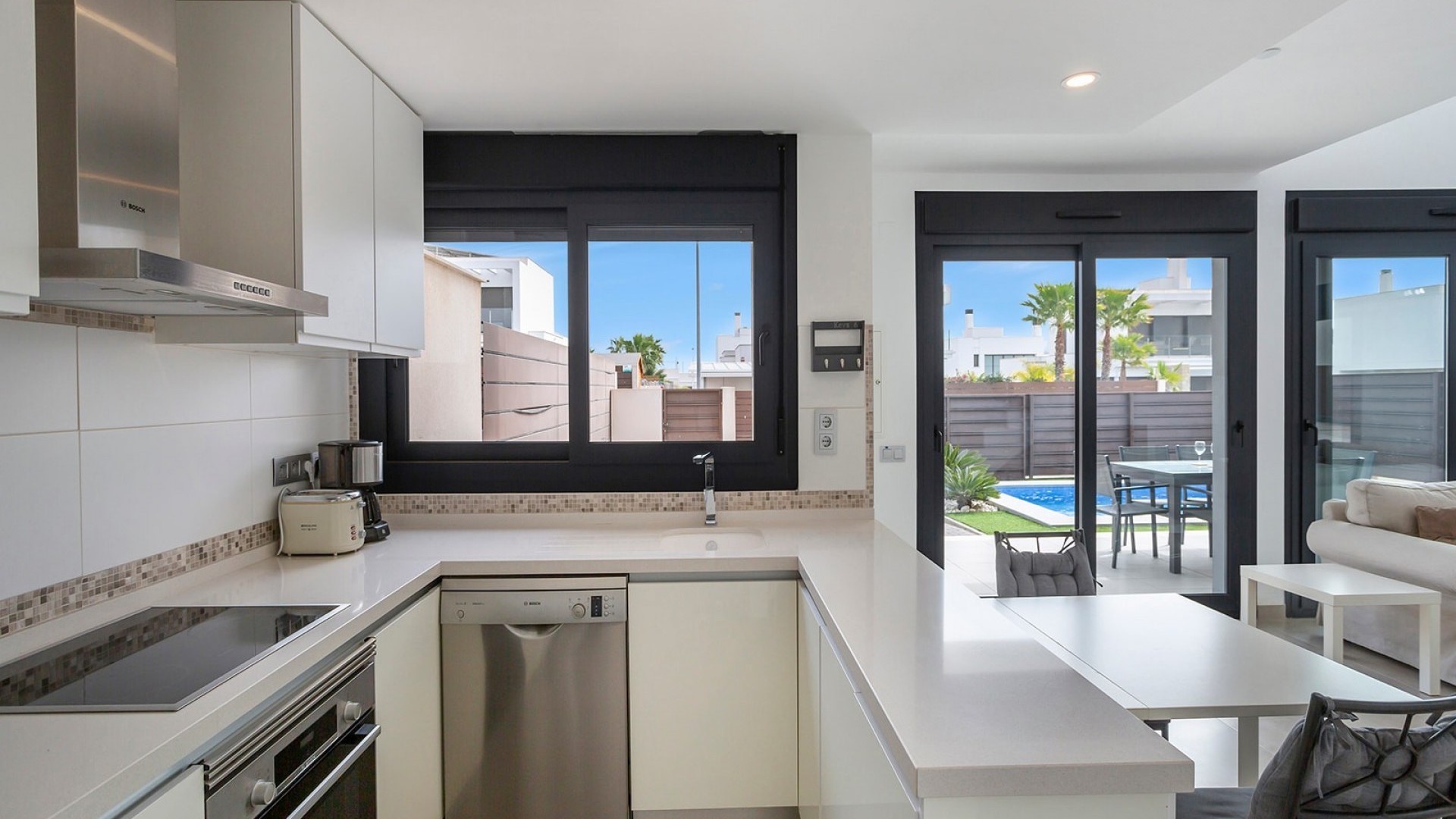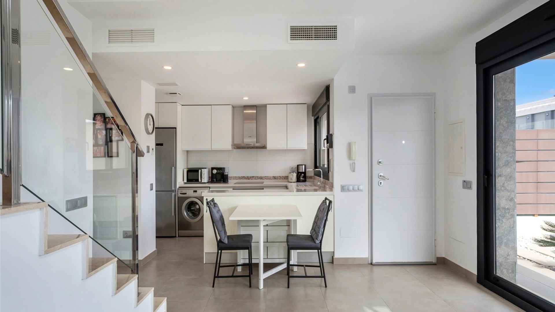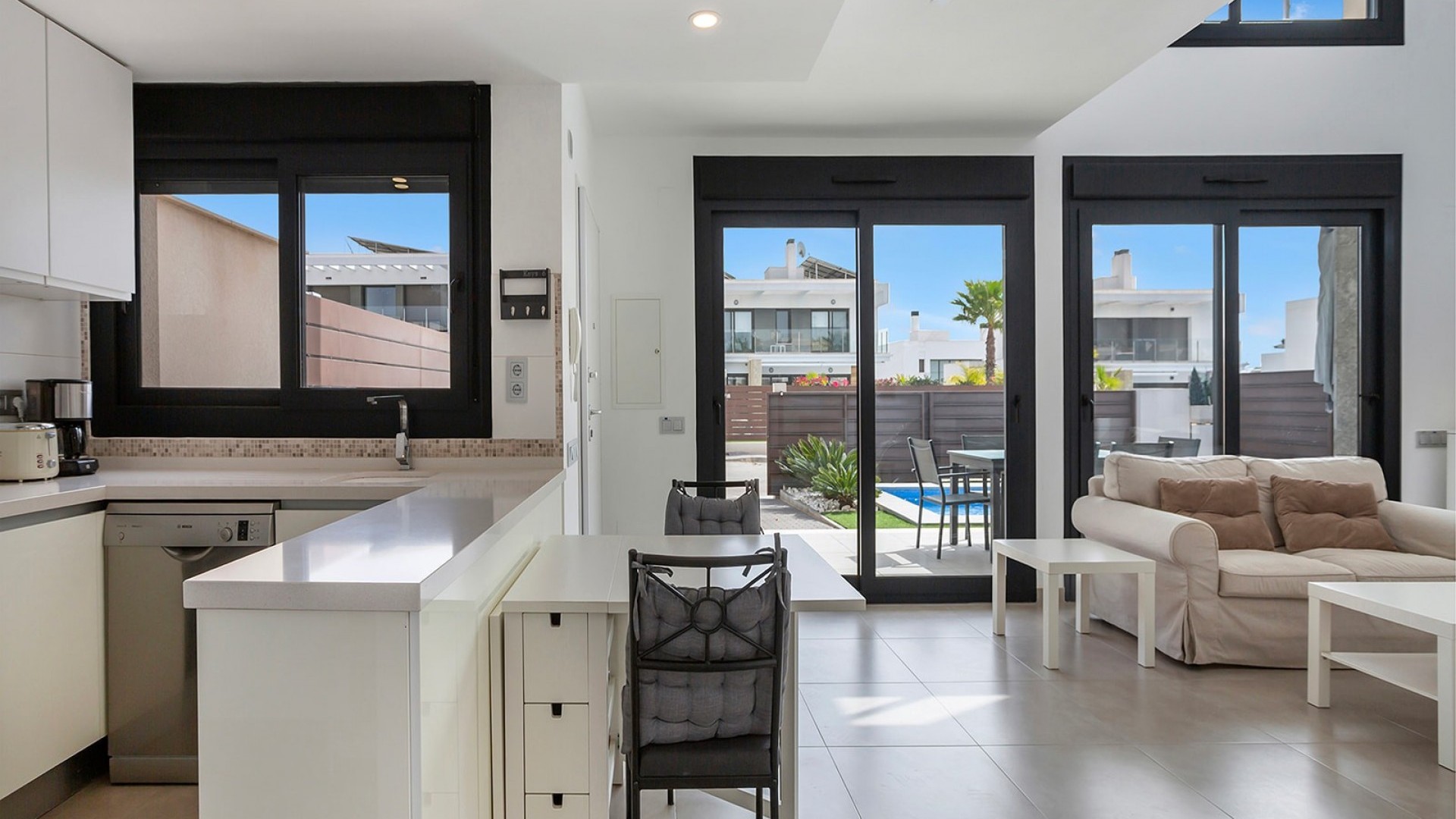 Deze luxueuze, moderne en volledig instapklare villa in Vistabella Golf heeft 3 ruime slaapkamers en 2 moderne badkamers met inloopdouches. De ruime woonkamer en alle 3 de slaapkamers hebben een rechtstreekse toegang tot terrassen. De keuken is open en ook zeer functioneel. De villa heeft een charmante tuin en een mooi privé zwembad (15m2). Het heeft een aantrekkelijke moderne inrichting en wordt volledig gemeubileerd verkocht. Ook airconditioning en de huishoudelijke apparatuur zijn bij de prijs inbegrepen. Op het domein van Vistabella Golf ligt een prachtige 18 holes golfbaan, ontworpen door de prestigieuze golfer Manuel Piñero. Er is ook een centraal gelegen supermarkt, evenals restaurants en bars, dus u vindt alles op loopafstand. Deze woonwijk tussen de sinaasappel- en citroenboomgaarden is een uitstekend gebied om van het rustige leven te genieten, terwijl u toch na een korte rit in de dynamische steden en de prachtige stranden van Torrevieja en Orihuela Costa bent (15 km). Of als u de voorkeur geeft aan een typisch Spaans dorp, kunt u een bezoek brengen aan Orihuela, dat op slechts 10 km afstand ligt.. Verder zijn er gemakkelijke verbindingen met de luchthavens van Alicante en Murcia, deze liggen op respectievelijk 35 of 55 minuten met de auto. Mis deze kans niet, deze zeer goed onderhouden villa heeft alles wat u nodig heeft voor een vakantiehuis, een winterverblijf of een investering in een woning aan de Costa Blanca