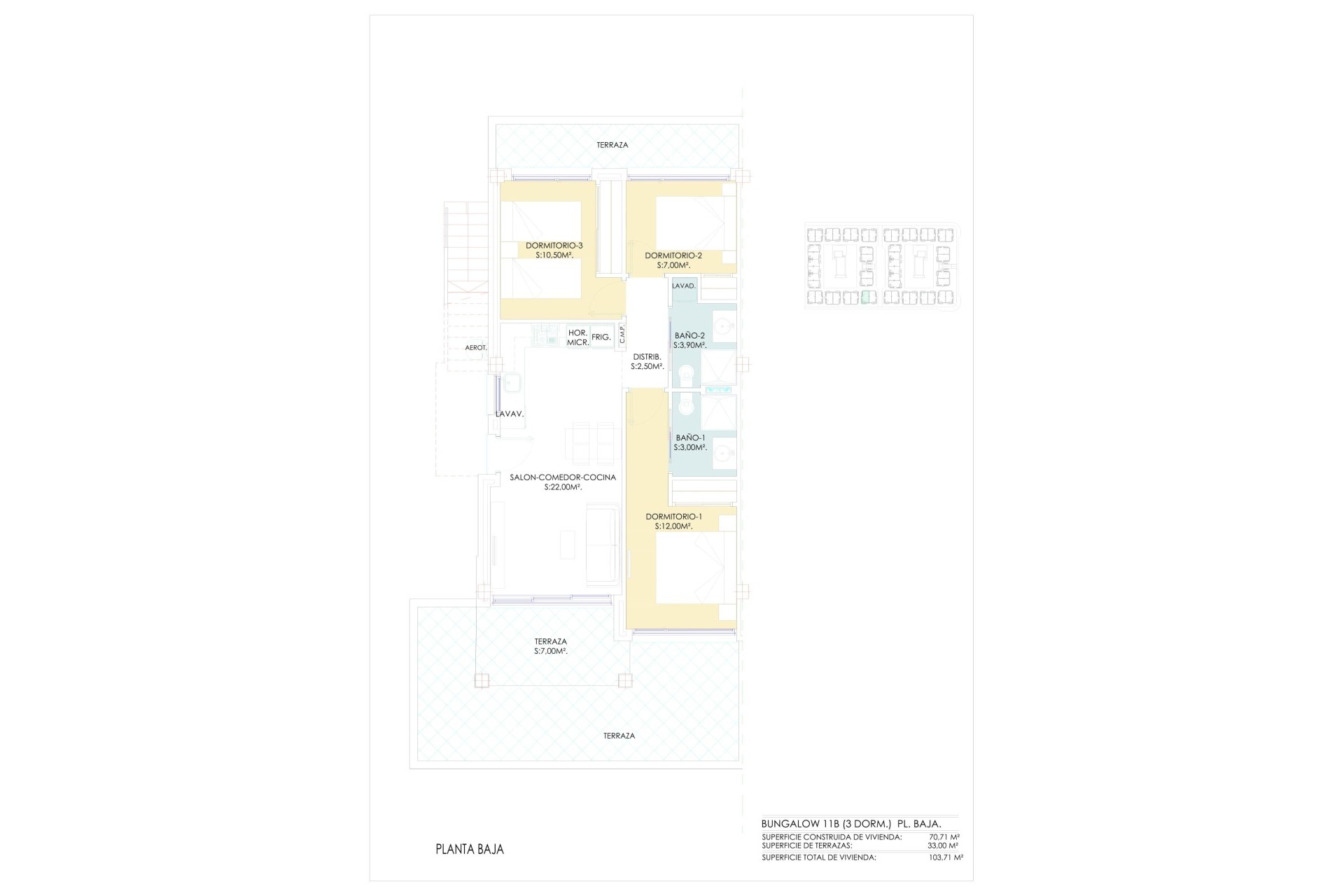 De buitenruimtes van deze eigendommen zijn ontworpen om optimaal te genieten van het mediterrane klimaat. Elke woning heeft een privéterras, ideaal om buiten te ontspannen. Bovendien beschikken de bungalows over een solarium, perfect om in de privacy van je eigen huis van de zon te genieten. De aanwezigheid van een pergola voegt een vleugje elegantie en functionaliteit toe, door schaduw en stijl te bieden. De gemeenschappelijke ruimtes omvatten goed onderhouden tuinen, die een groene en rustige omgeving bieden om te wandelen of te ontspannen.