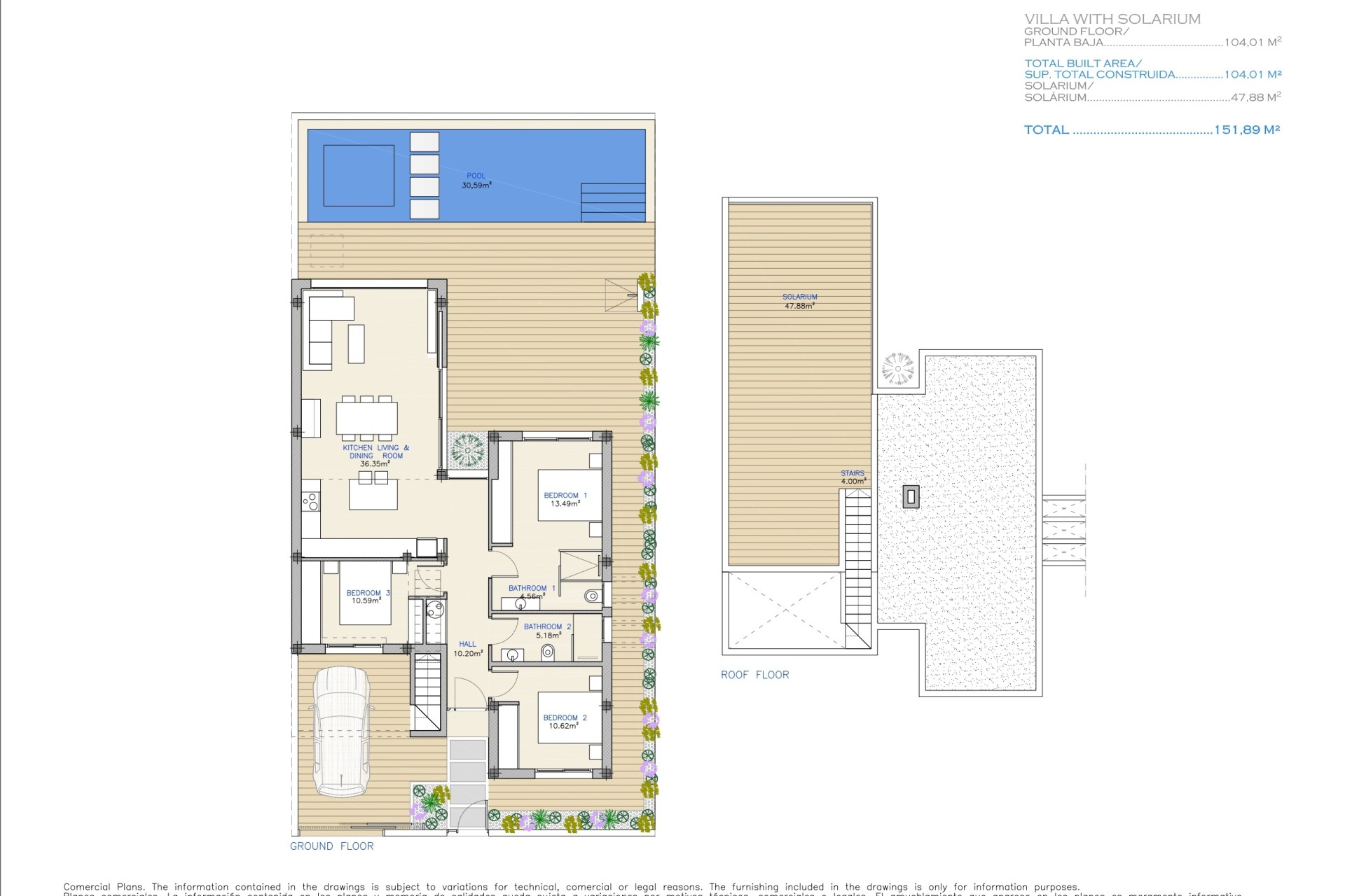 Het interieur van deze vrijstaande woningen is ontworpen met comfort en stijl in gedachten. Met een indeling die drie slaapkamers en twee badkamers omvat, is elke ruimte geoptimaliseerd voor ruimtelijkheid en functionaliteit. De porseleinen tegelvloeren geven een moderne uitstraling en zijn gemakkelijk te onderhouden. De woningen zijn uitgerust met airconditioning om het hele jaar door comfort te garanderen. Bovendien zijn ze voorzien van geïntegreerde apparaten, ingebouwde kasten die de opbergruimte maximaliseren, elektrische rolluiken voor extra gemak en een video-intercom die de veiligheid garandeert.