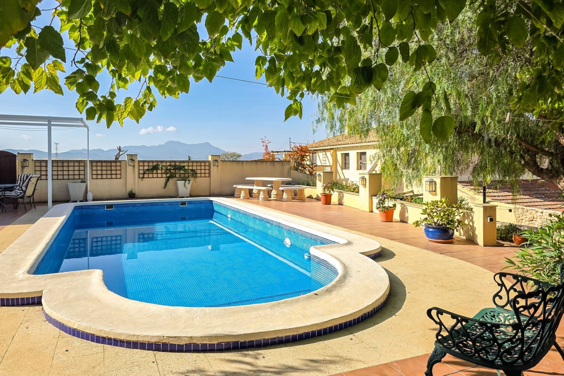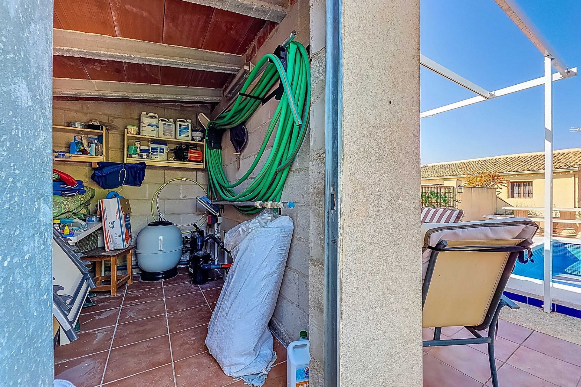 TerreinNaast de genoemde garage die is gelegen aan de zijde van de woonkamer, is er nog een separate garage aanwezig. De tuin met patio’s is fraai aangelegd met veel volwassen bomen en biedt vele mogelijkheden om zowel van de zon als van de schaduw te kunnen genieten. De tuin biedt volledige privacy en zo ook het zwembad. Naast het zwembad bevindt zich een poolhouse met bergruimte.