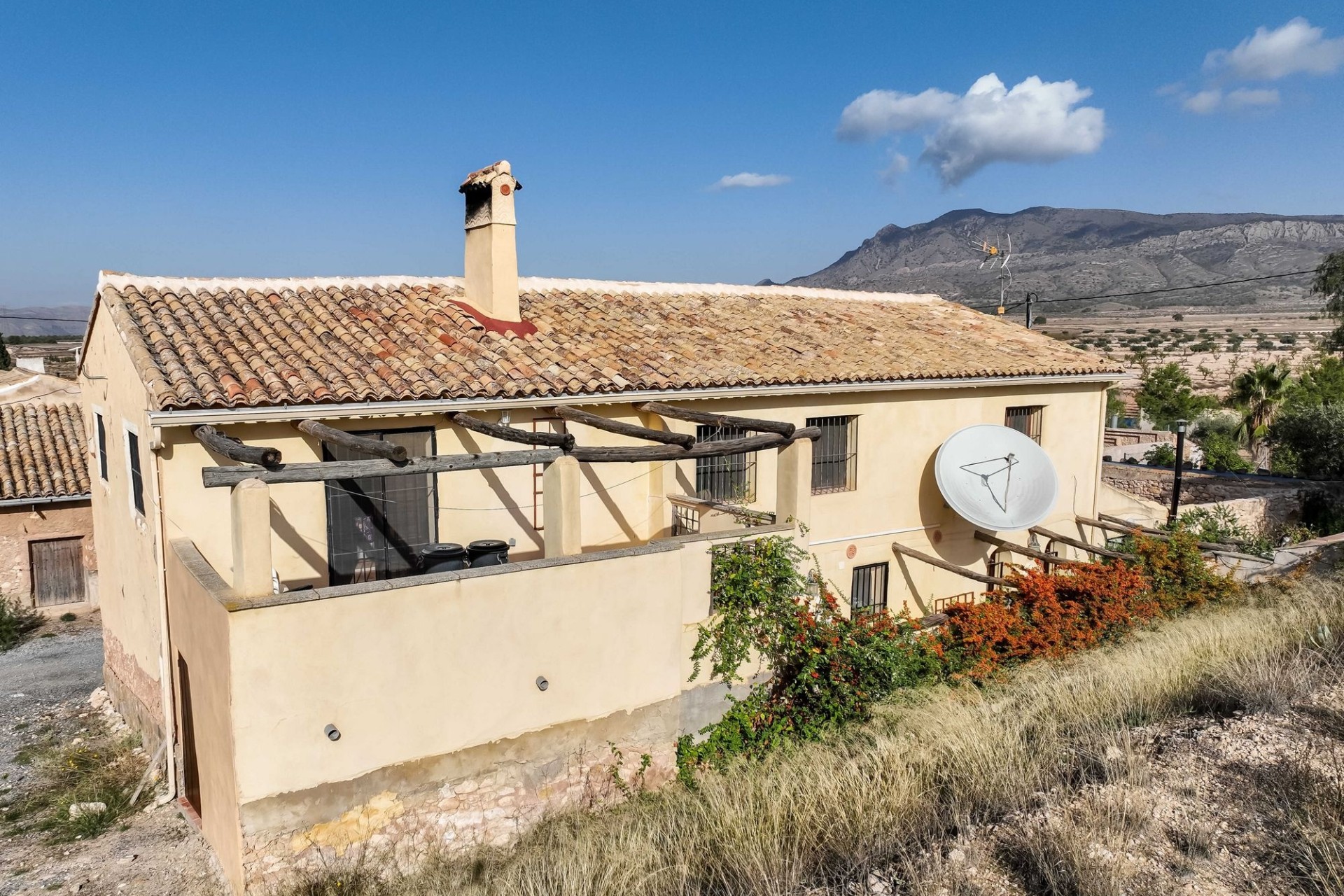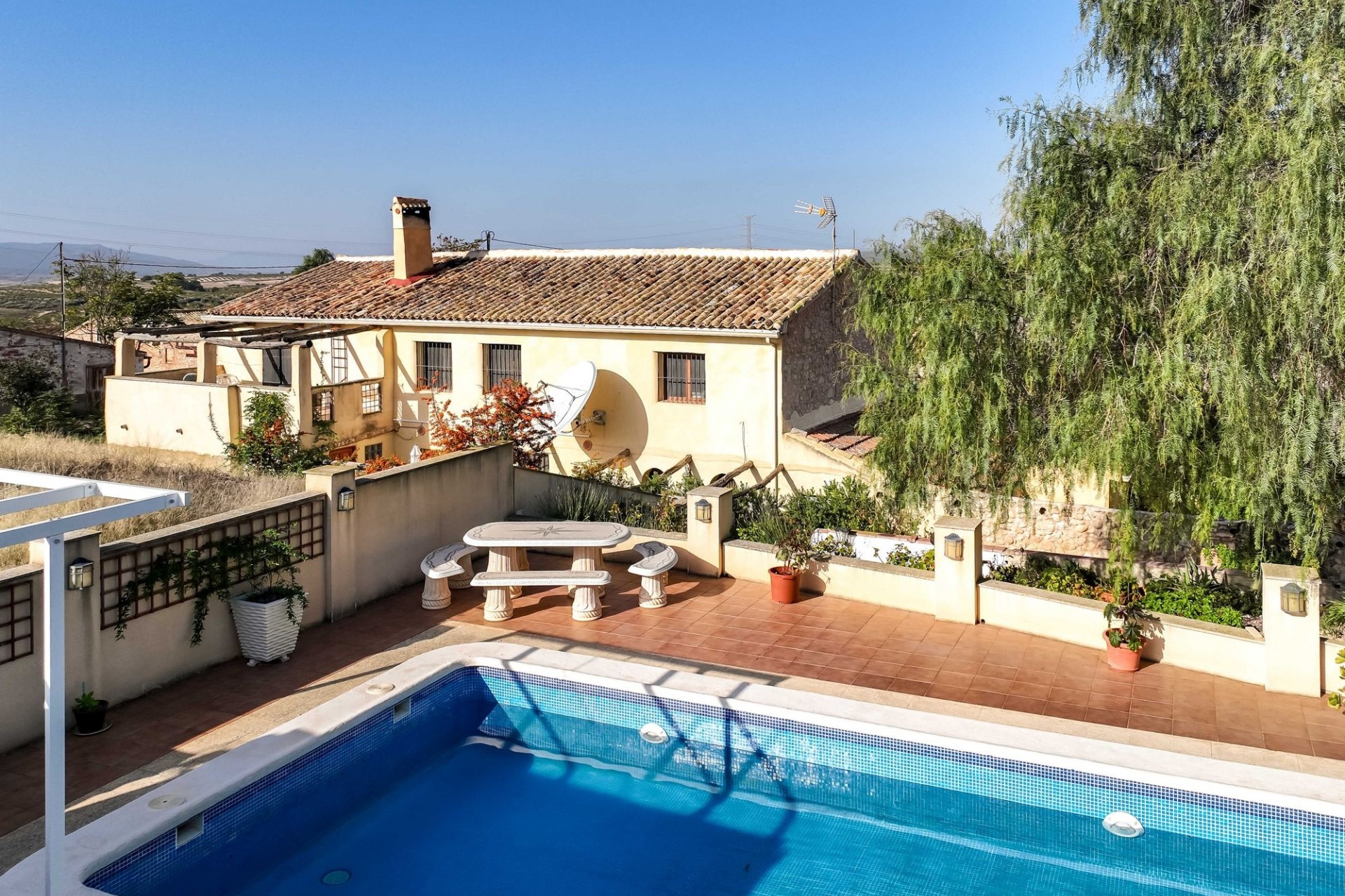 Dit landhuis is verdeeld over twee verdiepingen en heeft gezellige patio’s die overgaan in een fraai aangelegde tuin met zwembad en bovendien zijn er twee garages. De woning is rustig gelegen in een klein gehucht tussen Pinoso en Jumilla. De landelijke omgeving en het uitzicht zijn prachtig