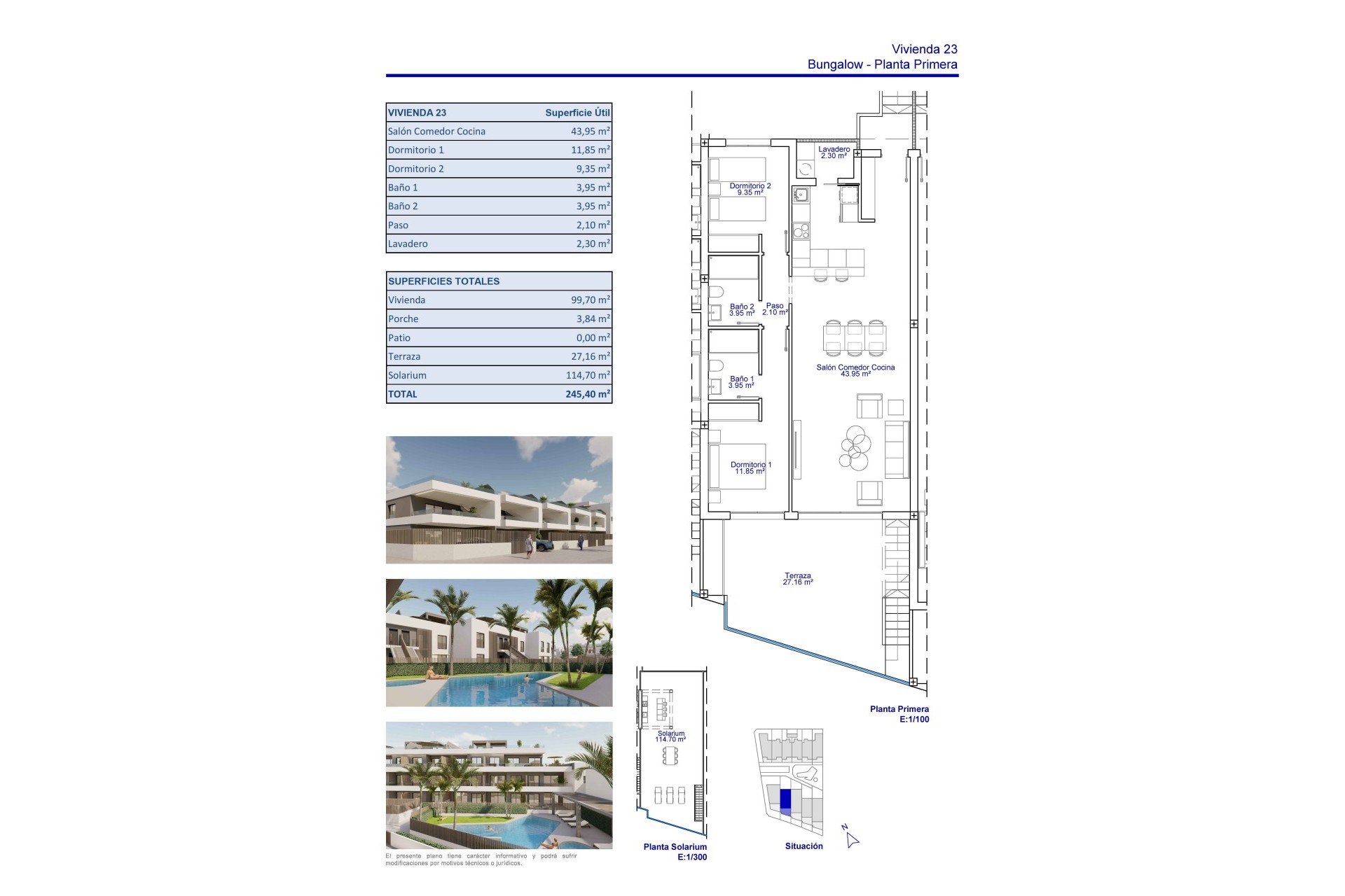 Binnen vallen de bungalows op door hun moderne en functionele ontwerp. De vloeren van porselein tegels geven een vleugje elegantie en zijn gemakkelijk te onderhouden. De woningen zijn uitgerust met inbouwkasten, die efficiënte en discrete opslag bieden. Bovendien zijn ze voorzien van een pre-installatie voor airconditioning, wat het hele jaar door comfort garandeert. De indeling is zorgvuldig gepland om de ruimte en het natuurlijke licht te optimaliseren, waardoor een gezellige en lichte sfeer ontstaat.